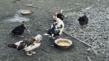 Мускусные утки (индоутки), разные масти: черно-белые, буро-белые. На фото — взрослые птицы и молодняк.