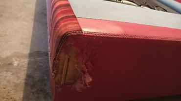 Визуальные детали: на спинке и одном из углов основания имеются повреждения обивки; видны следы износа на экокоже.
