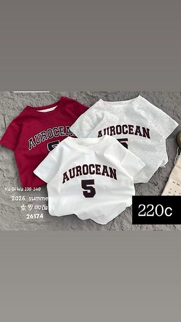 1) Серия AUROCEAN с номером 5 — базовый крой, крупный принт спереди. Цвета: бордовый, серый меланж, белый. Указание на ярлыке: Ku Qi Wu 100–140; артикул 26174; «2026 summer». Цена: 220 c.