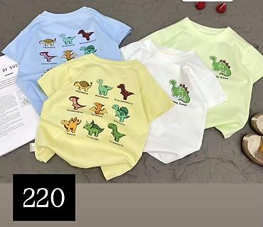 3) Серия с динозаврами — веселые принты: на одних моделях крупный динозаврик спереди, на других — коллекция динозавров с подписями на спинке. Цвета: голубой, лимонно-жёлтый, белый, светло-салатовый. Цена: 220.