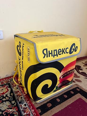 Термо-рюкзак курьерский Яндекс Go для доставки еды. - Формат: жёсткая изотермическая коробка-рюкзак. - Цвет и брендинг: жёлтый с логотипами «Яндекс Go» и надписью «Тамак жеткирүү». - Конструкция: ...