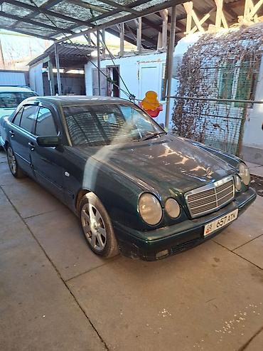 Mercedes-Benz E‑Class (W210) седан, тёмно‑зелёный цвет. Кузов с фирменной решёткой радиатора и двойной оптикой, легкосплавные диски, тонированные стёкла. Европейская версия с передним и задним противотуманными фарами, повторителями поворотов в крыльях. Номерные знаки KG на авто.