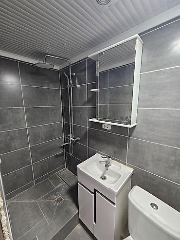 - Санузел: совмещенный, современная плитка, душевая зона с трапом и тропическим душем, умывальник с тумбой и зеркальным шкафом, унитаз, вытяжка.