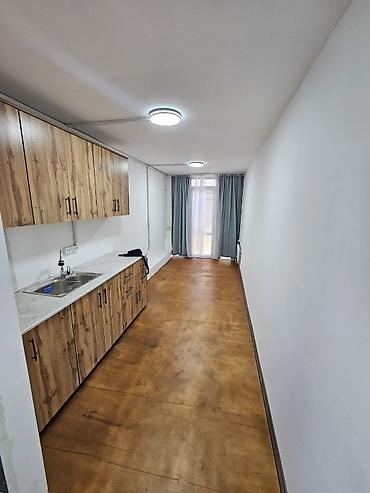 - Планировка: вытянутая студия с отдельной зоной кухни и спальным блоком.