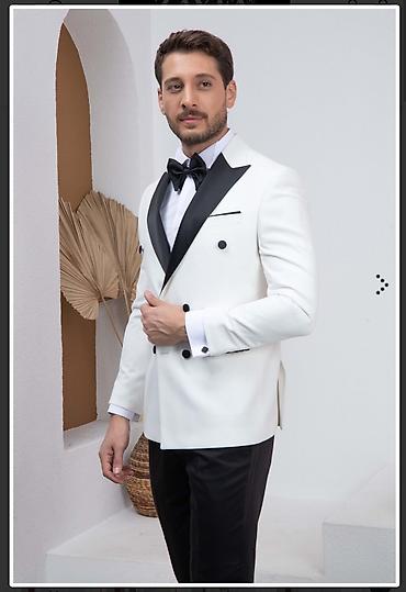 Мужской смокинг с эффектом деликатного мерцания. - Пиджак: двубортный, белый с блёсточным напылением; контрастные широкие черные атласные лацканы-шалька; чёрные пуговицы; нагрудная петлица с бутон...