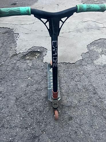 Отлично подходит для освоения бани‑хопов, випов, гринд‑трюков и катания в парке/на стрит‑спотах. Комплект полностью собран: дека, руль, вилка, зажим, колёса, тормоз, грипсы. Цвета: черный/серый с оранжевыми колёсами и зелёными грипсами.