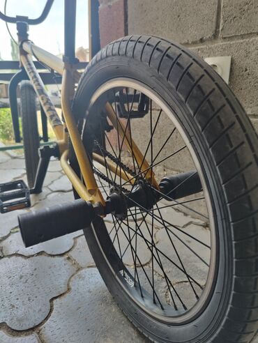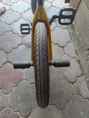 BMX-велосипед для трюков и катания по городу. Особенности: - Стальная рама BMX с усиленной верхней трубой. - Колеса примерно 20" с широкими покрышками полуслик/грунт и частыми спицами. - Односкоро...