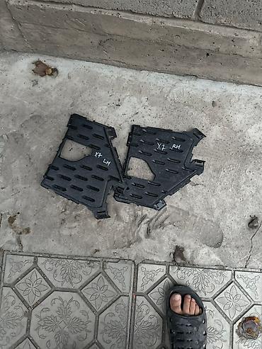 Две черные пластиковые защитные пластины, предназначенные для установки под днищем автомобиля. Каждая пластина имеет вентиляционные отверстия и вырезы, обеспечивающие циркуляцию воздуха и доступ к необходимым компонентам. Могут использоваться для защиты от грязи, воды и мелких камней. Идеально подходят для ремонта или замены поврежденных элементов защиты днища.