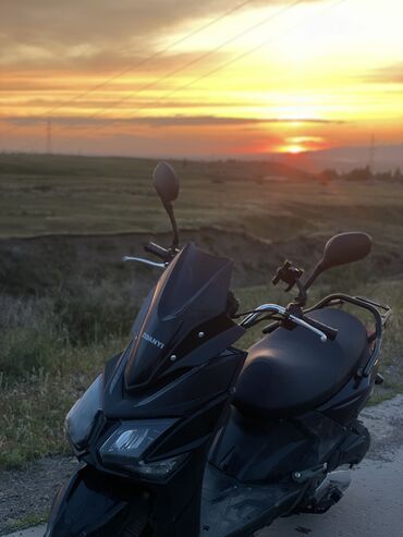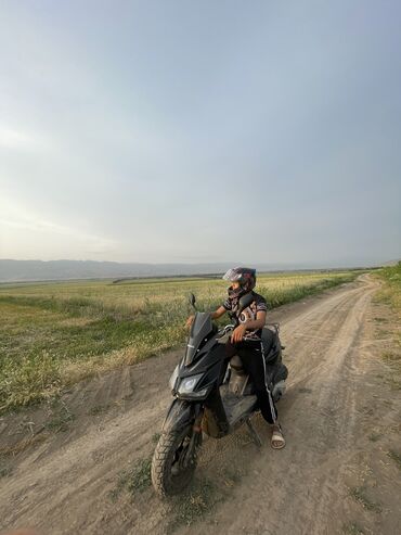 Черный скутер с ветровым стеклом и зеркалами заднего вида. Этот скутер может быть использован для поездок по городу или окрестностям, обеспечивая удобство и маневренность. Легкий в управлении и подходит для ежедневных поездок. Нужно заделать косметику переда, продлю потому что упал с него есть торг!!!!