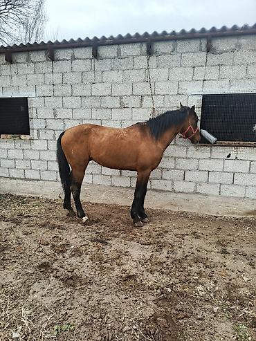 Айгыр , жоош , 2 асый Лошадь, гнедая масть - Тип: верхово-упряжная лошадь - Масть: гнедая, темный корпус, черная грива и хвост - Отметины: белые «носки» на задних ногах (видны на фото) - Конституц...