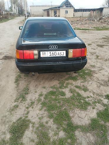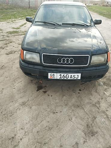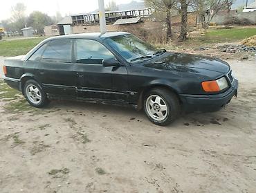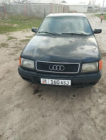 Audi 100 C4, черный седан, 4 двери. Киргизские номера 08 KG 160 ASJ. Кузов классической формы с широкими бамперами, фирменная решетка с четырьмя кольцами, прямоугольные фары и задние фонари с оранжевыми указателями поворота. Литые алюминиевые диски, резина всесезонная. Зеркала и молдинги в цвет кузова, заднее стекло с обогревом. Буксировочная проушина спереди, выхлопная труба сзади слева. Просторный салон для 5 мест, большой багажник. Подвеска рассчитана на ровные и грунтовые дороги, клиренс позволяет уверенно двигаться по проселку. Подходит для ежедневных поездок и дальних переездов, известна надежным двигателем и простой механикой, удобна в обслуживании и доступна по запчастям.