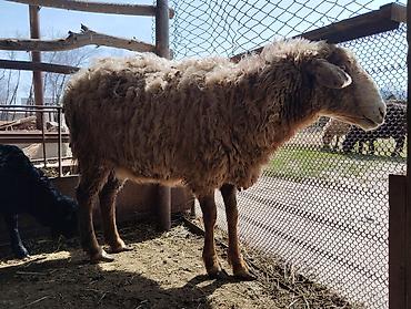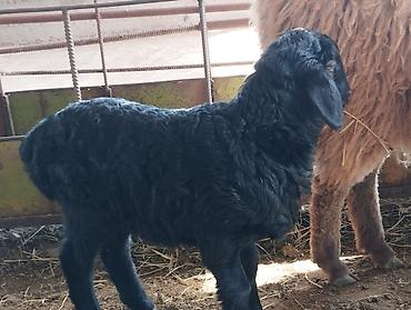 Овцы чёрные, крупные, с густой кудрявой шерстью. На фото — пара взрослых животных с длинными ногами и крепким корпусом, ухоженные, очень упитанные содержатся в просторном деревянном загоне с навесо...