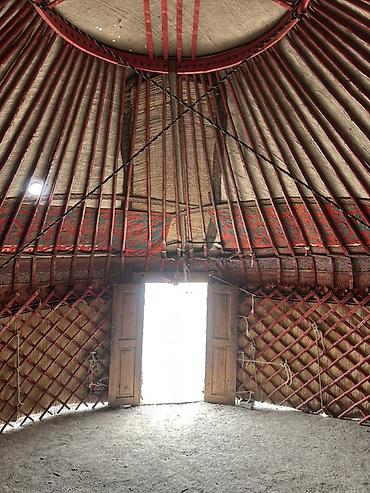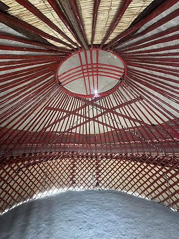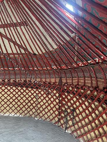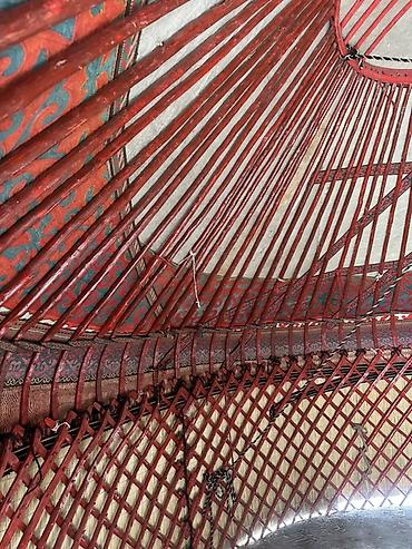 - Каркас: раздвижные решётчатые стены (кереге) и радиальные стропила (уык), окрашенные в красный цвет с национальной росписью. Центральное кольцо (шанырак) с вентиляционным/световым отверстием.
