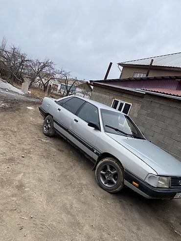 Audi 100 C3 седан, серебристый цвет кузова. Классический дизайн с прямыми линиями, широкая решётка радиатора и прямоугольная оптика. Кузов 4-дверный, тонированные стекла по кругу.