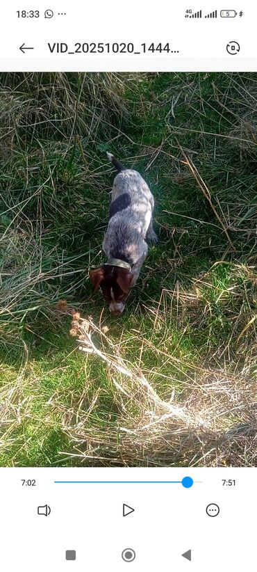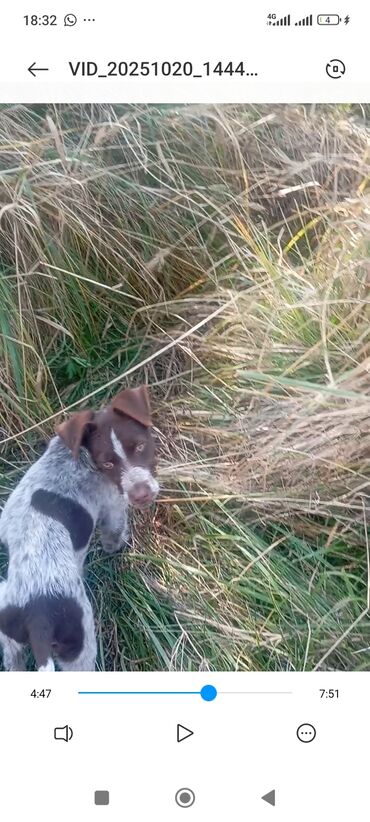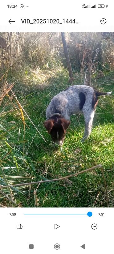 Щенок охотничьей породы (окрас: коричнево-пегий с пятном на спине). На фото/видео — активный, любознательный, работает носом в высокой траве, уверенно держится на местности. Висячие уши, светлая стрелка на лбу, короткая плотная шерсть с крапом, тёмная маска. Нос тёмный, глаза светлые. Хвост средней длины, хорошо выраженный корпус.