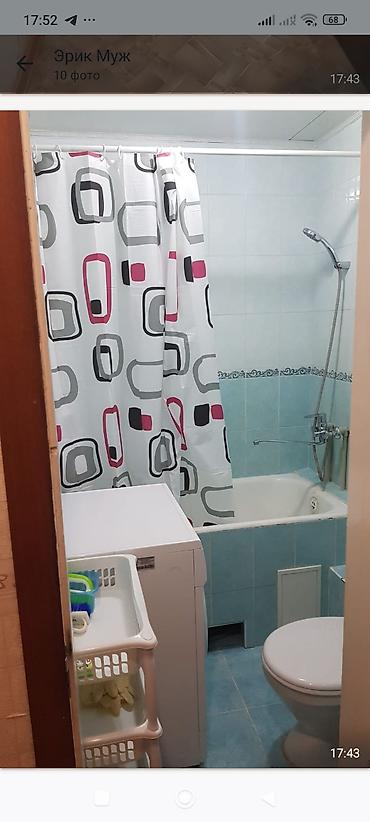 - Санузел совмещённый: ванна с душем и шторкой, унитаз, стиральная машина, этажерка для хранения, стены и пол в плитке.