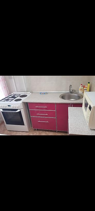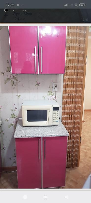 - Кухонная зона: напольный и навесной шкафы с глянцевыми фасадами, столешница из ЛДСП, микроволновая печь LG, отдельностоящий холодильник.