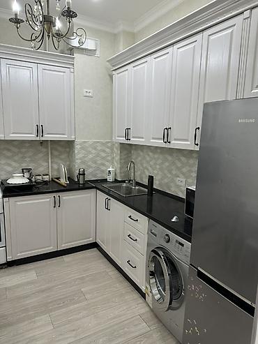 - Кухня в классическом стиле: угловой гарнитур с множеством шкафов, мойка, варочная панель/плита, холодильник Samsung, стиральная машина, рабочая поверхность из тёмного камня, фартук с геометрической плиткой, люстра.