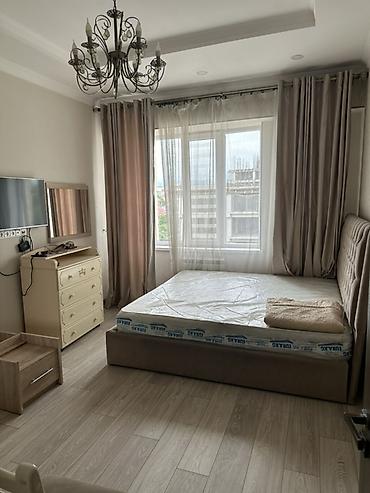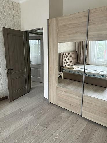 - Просторная спальня с двуспальной кроватью, мягким изголовьем, новым матрасом, тумбой, комодом с зеркалом, настенным телевизором. Большое окно с плотными шторами и тюлем, потолочная люстра, натяжной потолок с точечными светильниками. Вместительный шкаф-купе с зеркальными дверями.
