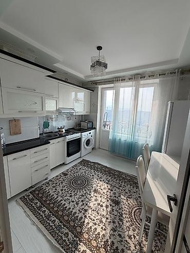 - Кухня с выходом на балкон: гарнитур с глянцевыми фасадами, рабочая поверхность и мойка, варочная панель и духовка, вытяжка, стиральная машина, холодильник, обеденный стол и стулья, большая оконная группа, ковёр.