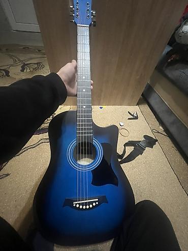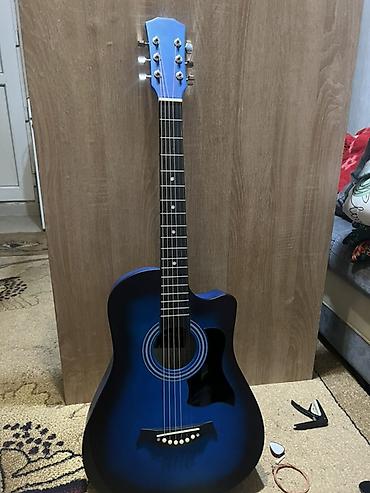 Акустическая гитара 4/4, форма корпуса Dreadnought с вырезом (cutaway), цвет градиентный синий. 6 струн, металлические, анкеры-колки хромированные, палисандровая (по виду) накладка грифа с точечными инкрустациями, классический фиксированный бридж с белыми пинами. Розетка с декоративными кольцами, глянцевый пикгард.