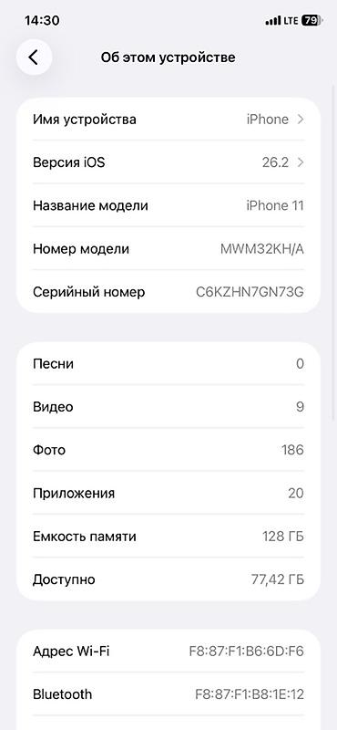 IPhone 11, черный, 64 ГБ Характеристики и детали по фото: - Модель: iPhone 11 (номер модели MWLT2RU/A) - Память: 64 ГБ (доступно ~14,21 ГБ на момент скриншота) - iOS: версия 18.0 - Экран: Liquid ...