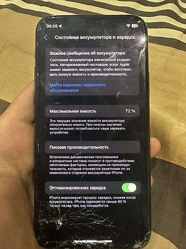 - На скриншоте «Состояние аккумулятора» — максимальная ёмкость 72%; отображается системное сообщение о необходимости обслуживания батареи