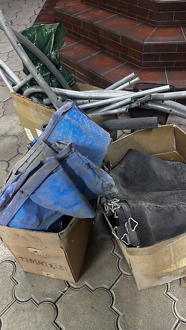 - Разборная конструкция; на фото представлены комплектующие: трубы каркаса, защитные элементы, полотно, сетка.