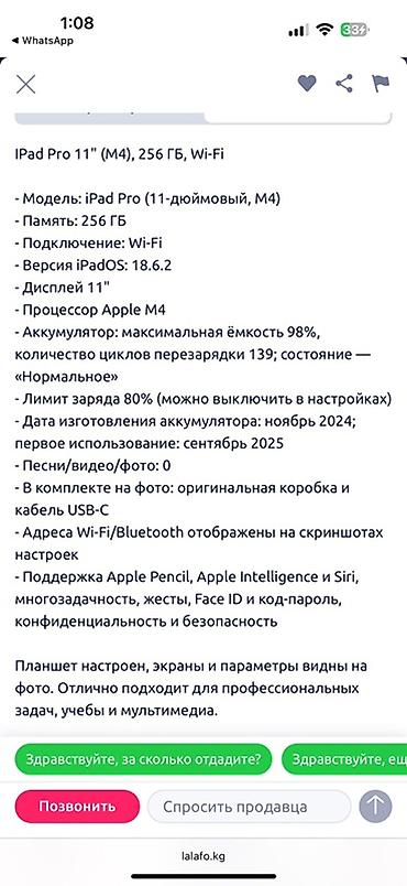 - Поддержка: Apple Pencil, Apple Intelligence и Siri, многозадачность, жесты, Face ID и код‑пароль, расширенные функции конфиденциальности и безопасности