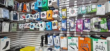 Широкий ассортимент электроники и аксессуаров, представленный в розничной витрине. Включает в себя разнообразные чехлы для мобильных телефонов, зарядные устройства, кабели, наушники и другие гаджеты. Идеально подходит для оснащения магазина или как источник аксессуаров для личного использования. Представлены различные модели и дизайны для удовлетворения разнообразных потребностей пользователей.