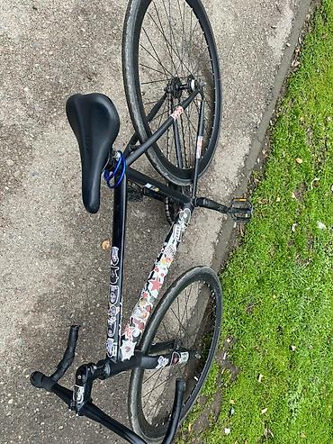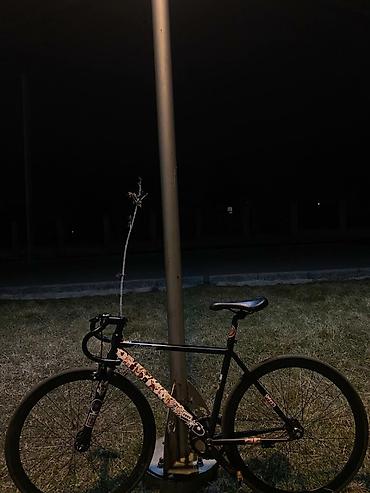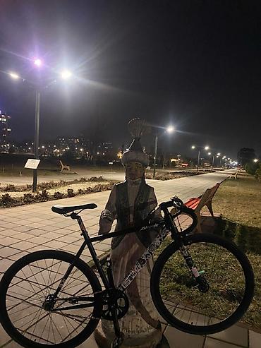- Трансмиссия: одинарная передача без переключателей, установлен фикс (фиксед) с торможением обратным давлением; на кареточном узле звезда под цепь трекового стандарта.