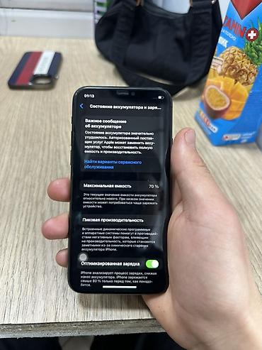 - Показатель аккумулятора на фото: максимальная ёмкость 70%. В разделе «Состояние аккумулятора» отображается системное уведомление о необходимости сервисного обслуживания; включена «Оптимизированная зарядка».