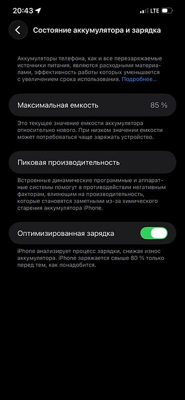 - Аккумулятор: максимальная ёмкость 85%, доступна опция «Оптимизированная зарядка»