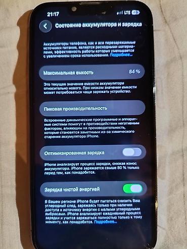 - Пункт «Состояние аккумулятора и зарядка»: емкость 84%, оптимизированная зарядка выключена, «Зарядка чистой энергией» включена