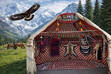 Комплектация по фото: каркас «жарты» с войлочной обшивкой, декоративные ленты и кисти, настенные панно/кошмы, ковры-паласы на полу, элементы из меха.