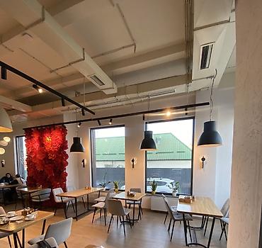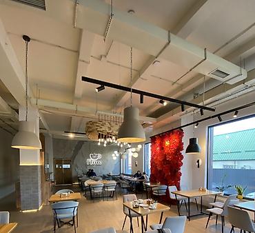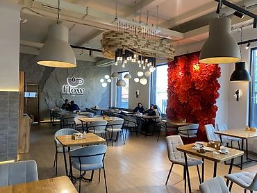 - Современная кофейня с просторным светлым залом и дизайнерским интерьером: акцентная стена с цветочными инсталляциями, подвесные светильники, удобные столы и кресла.