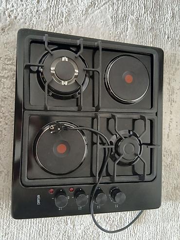 - 4 зоны: 2 газовые конфорки с чугунными решетками и 2 электрические конфорки (чугунные «блины» с индикатором нагрева в центре).