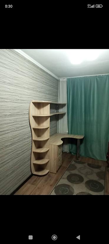 - Мебель: односпальная кровать, шкаф-купе/распашной высокий двухдверный в тёмном дереве, прикроватный/рабочий столик, угловой рабочий стол светлого дерева с хромированной опорой, тумба с тремя выдвижными ящиками, открытый стеллаж с полками.