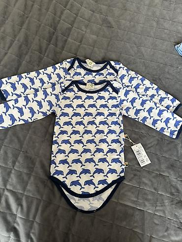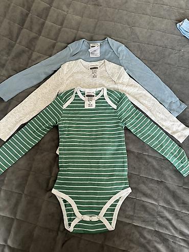 - Три боди с длинным рукавом: голубое, светло‑серое меланж и зелёное в белую полоску (ярлыки: 18–24 мес, 86/92). Плечи с запахом, нижняя застёжка на кнопках.