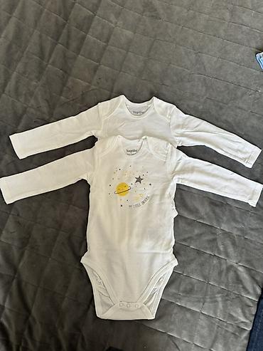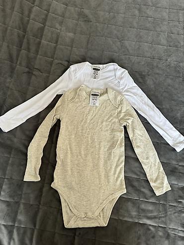 - Белое и светло‑серое меланж (ярлыки: 18–24 мес, 86/92). Плечи с запахом для удобства переодевания, застёжки-кнопки внизу.