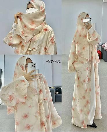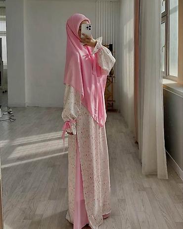 - Состоит из длинного платья-абаи/халата и накидки-хиджаба. Варианты: светло-кремовый с нежным розовым цветочным принтом; светло-розовый однотонный хиджаб с платьем в мелкий розовый рисунок.