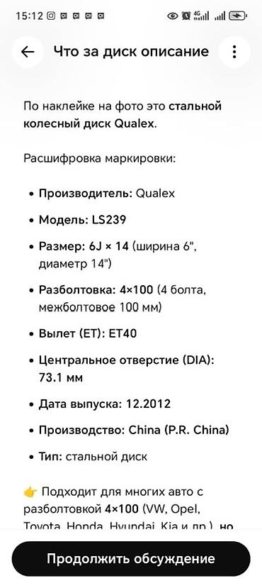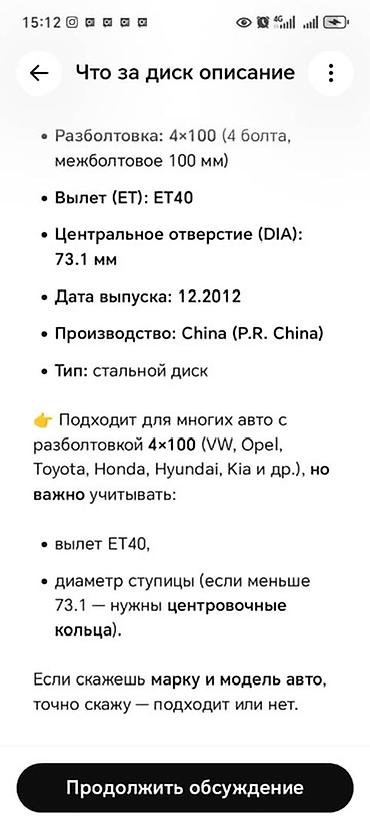 - Разболтовка: 4 отверстия (4х100/4х98 — уточняйте по замеру)