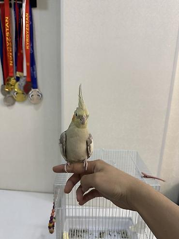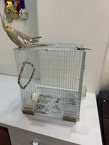 Попугай корелла с клеткой. Описание: - Вид: корелла (нимфа), окрас светлый с желтой маской и оранжевыми “щеками”. - В комплекте: металлическая клетка прямоугольной формы с выдвижным поддоном, двум...