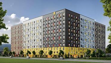 Жилой комплекс ARTWIN — современный многосекционный дом переменной этажности с яркими фасадами и большими окнами. Архитектура выполнена в контрастной палитре (серый, белый, голубой и жёлтый), что придаёт комплексу выразительный облик. Запроектированы: