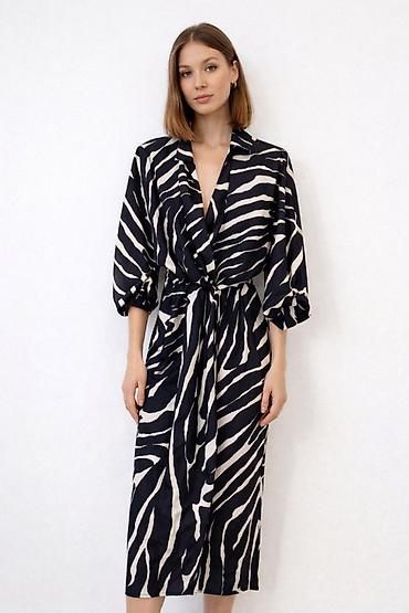 Платье макси с принтами и поясом - Длина: макси - Крой: свободный силуэт с акцентом на талии, съёмный пояс с круглой пряжкой в тон - Верх: стойка-воротник, планка на пуговицах по всей длине - Рука...