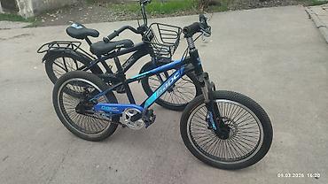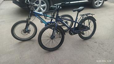 Два велосипеда разного размера. - Модель 1: горный/подростковый, рама с амортизатором (двухподвес), передняя вилка с амортизацией, колеса примерно 24". Руль с прямой перекладиной, тормоза ободные,...