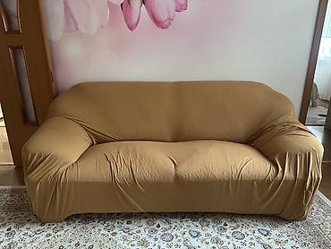 Диван 3‑местный, мягкий, с высокими подлокотниками и глубокими посадочными местами. Эргономичная спинка с выраженными боковыми поддержками, широкий центральный сектор. Обивка под диваном — светлая (кремовая/беж), кожаный на ощупь мягкая, с аккуратной строчкой; сверху надет эластичный однотонный чехол тёплого карамельного оттенка, облегающий форму дивана. Есть чуть протертости. Дивандек в подарок