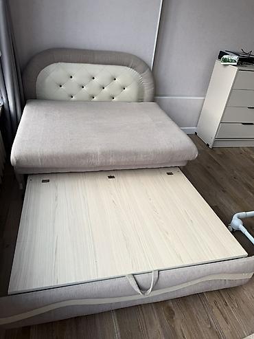 - Компактный диван, раскладывается в полноценное спальное место за счет выкатной секции на деревянной платформе.