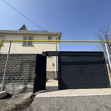- Участок огорожен забором из блоков; установлены откатные/подъемные металлические ворота и калитка.