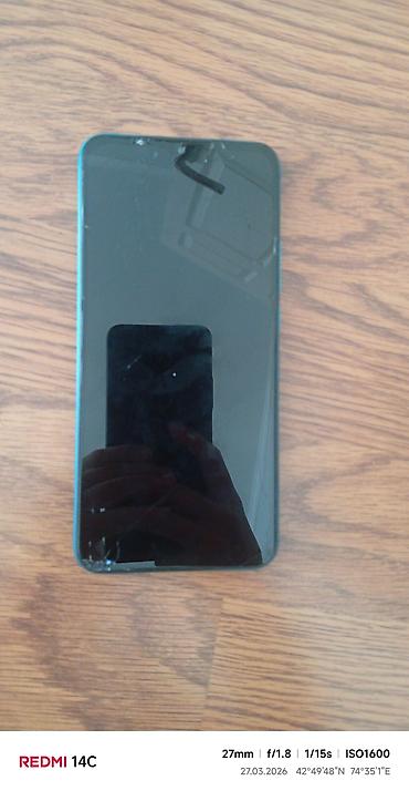 Смартфон Redmi (серия с вертикальным блоком камер и сканером отпечатка сзади), бирюзовый корпус.